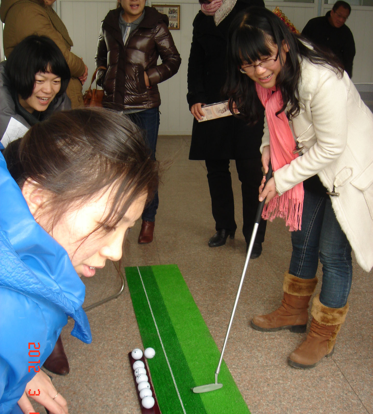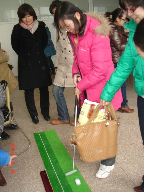 三八妇女节即将到来,为此,bw必威西汉姆联官网工会分会利用周二中午开会之前的一个半小时举办了一场生动有趣的“高尔夫球比赛”。宋老师特意将自己家里的高尔夫球推杆练习器搬到了公司的工会活动室。