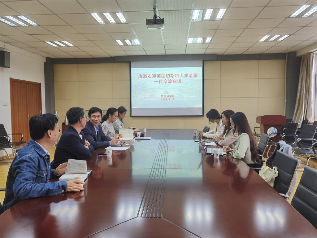 5月19日下午,英国切斯特大学中国代表一行来公司访问交流。bw必威西汉姆联官网经理尹洪山、党委书记曲斌艳、正处级组织员王培山、副经理康宁、党委副书记兼副经理王晓娜参加座谈。