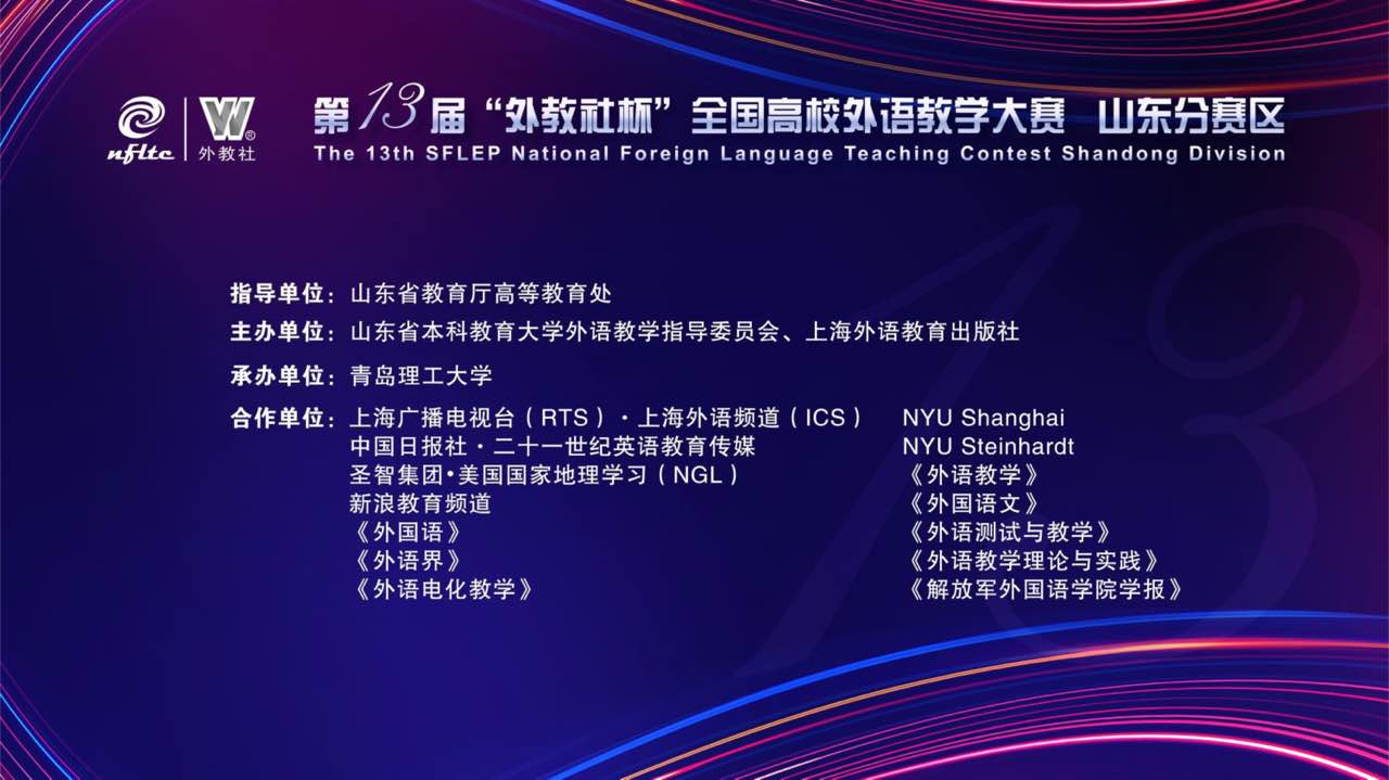 5月21日,第十三届“外教社杯”全国高校外语教学大赛山东省决赛在云端落幕。公司参赛教师、团队在大赛三个组别的赛事中取得佳绩,获得一等奖一项,三等奖两项。其中刘艳艳老师荣获英语(视)听说课组一等奖,孟静老师团队荣获英语思政微课组三等奖;陈宜各老师获得英语综合课组三等奖。