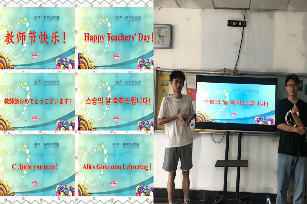 来到四楼语音室,电子提示屏上运用五国语言滚动展示着“教师节快乐”的字样,突出了公司的专业特点;配合着《听我说谢谢你》的背景音乐,同学们下课后纷纷前来“比心”打卡。