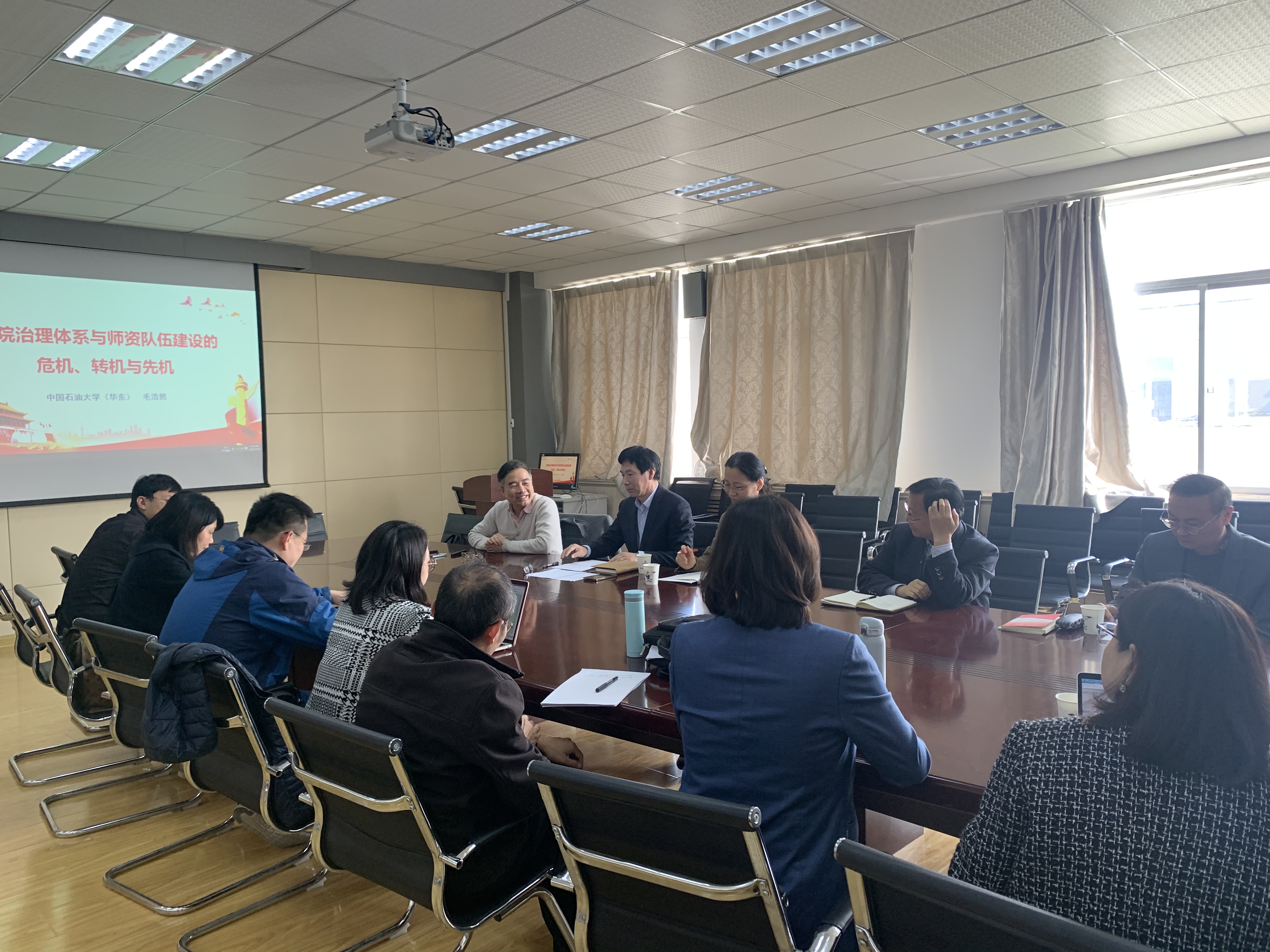为深入开展学习贯彻习近平新时代中国特色社会主义思想主题教育,联系实际深化理论学习,4月25日,外国语公司党委邀请中国石油大学(华东)bw必威西汉姆联官网经理毛浩然教授作《公司治理体系与团队队伍建设的危机、转机与先机》专题辅导报告。经理尹洪山主持,公司班子成员、公司管理骨干和部分学术骨干参加。