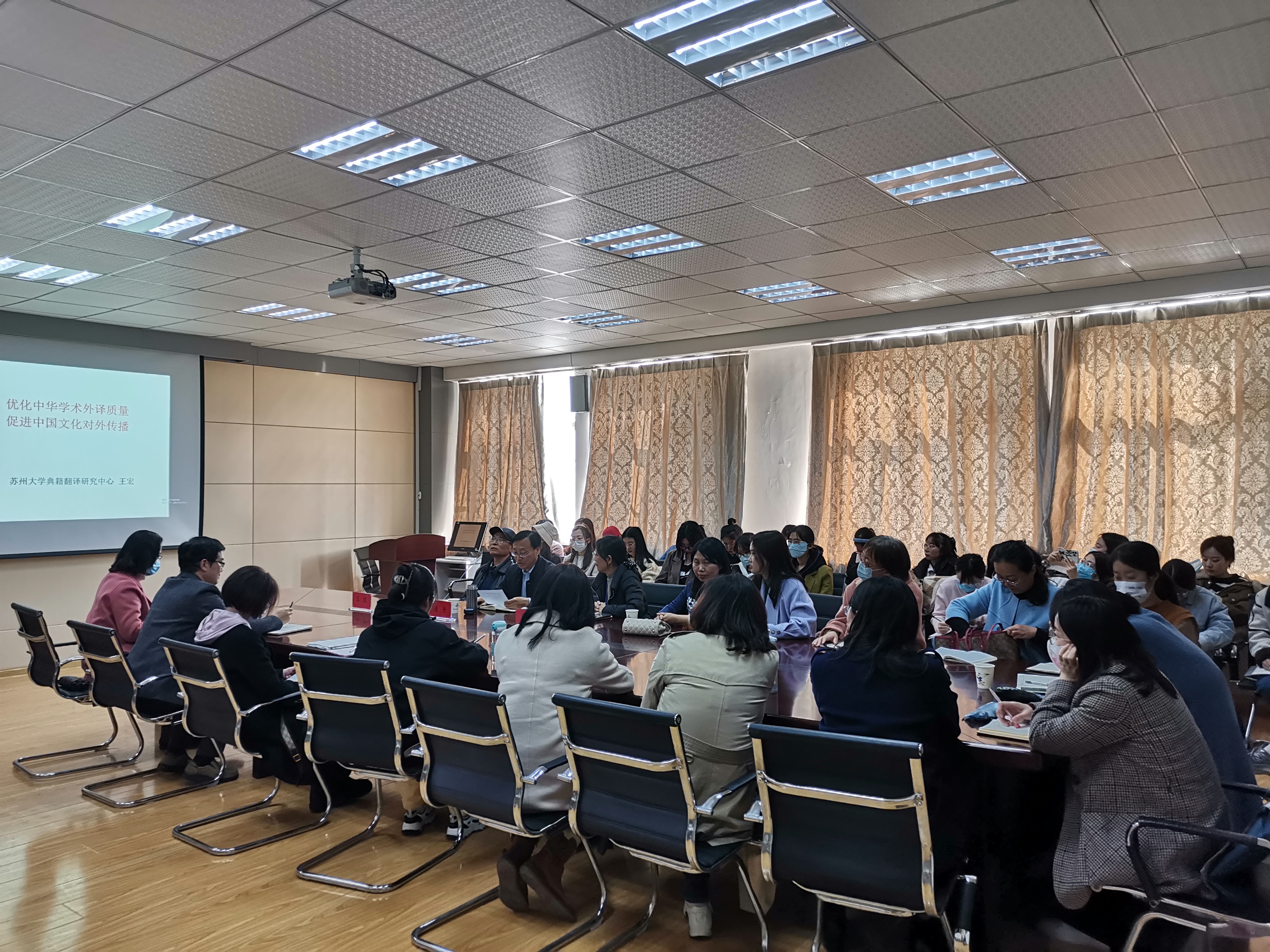 3月14日下午15点,苏州大学典籍英译首席专家、博士生导师王宏教授应公司邀请,在外语公司517会议室做了题为《优化中华学术外译质量促进中国文化对外传播》学术讲座。公司党委书记曲斌艳、校人文社科处副处长戴尊红、公司副经理刘靖教授出席。公司全体研究生及部分教师参加本次讲座。讲座由副经理康宁教授主持。