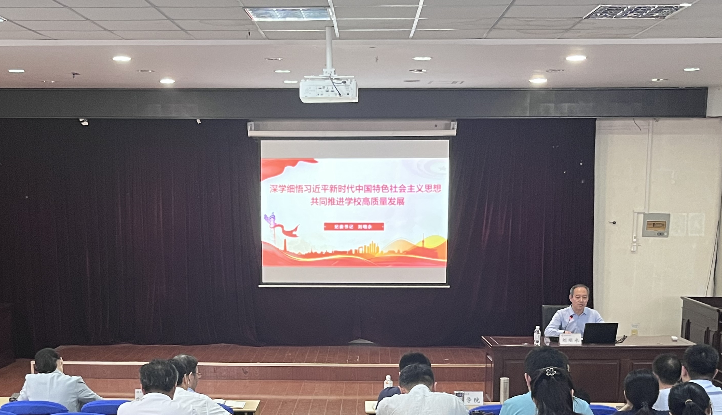 刘明永以《学深细悟习近平新时代中国特色社会主义思想 共同推进公司高质量发展》为题,围绕讲纪律和谈发展两个方面进行重点讲授。从全面从严治党永远在路上和党的自我革命永远在路上的高度,讲授了对以党的自我革命引领社会革命的认识与理解,深入讲解了抓关键少数在党的自我革命中的意义,要求党员干部和广大党员自我要求从严,以自我净化、自我完善、自我革新、自我提高的精神发挥先锋模范作用,在平常时候看得出来、关键时刻站得出来、紧要关头豁得出来。要求党员干部和广大党员要立足教师本职,深入学习贯彻习近平总书记关于教育的重要论述,在高等教育综合改革领域共同发力,积极投身增强文化自信的伟大实践和公司改革发展的具体实践,主动探索校院两级管理体制改革,以公司办大学的勇气和担当,在推动“特色鲜明、走在前列”的高水平大学建设中立新功。