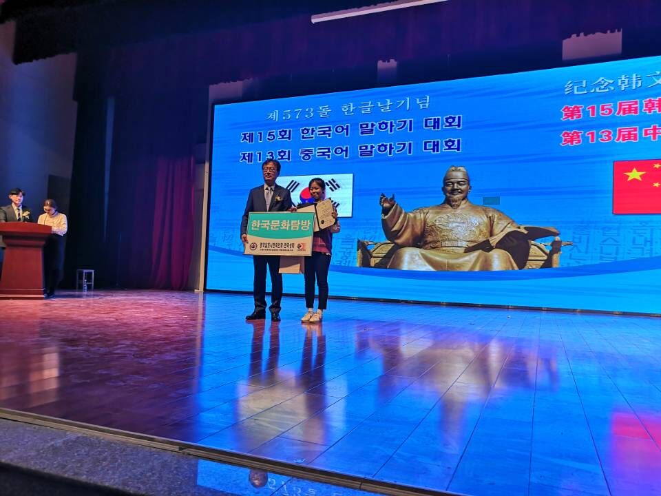 bw必威西汉姆联官网朝鲜语系16级宋雨桐同学参加第十五届山东省韩语演讲比赛,以优异的成绩获得“唐津市市长奖”,并获得韩国七日文化体验游的机会。