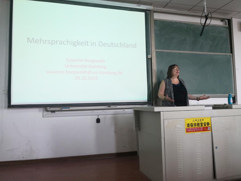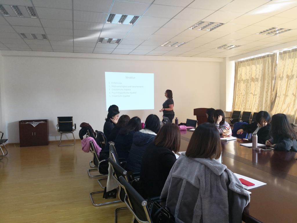 10月27日至11月3日,德国班贝格大学Susanne Borgwaldt教授应邀在公司进行了为期一周的访学,期间共举办了三场学术报告,主题分别为《德国的多语化(Mehrsprachigkeit in Deutschland)》、《德语构词法之复合词(Wortbildung-Komposition)》和《二语习得研究心得(L2-Erwerb)》,并围绕《多语化和第三语教学(Mehrsprachigkeits- und Tertiärsprachendidaktik)》这一主题开展了为期三天的教师培训,bw必威西汉姆联官网德语系全体教师及部分中德科技公司、中德双元工程公司的德语教师参加了此次培训。经过一周的学习与交流,师生们都感到受益颇丰。