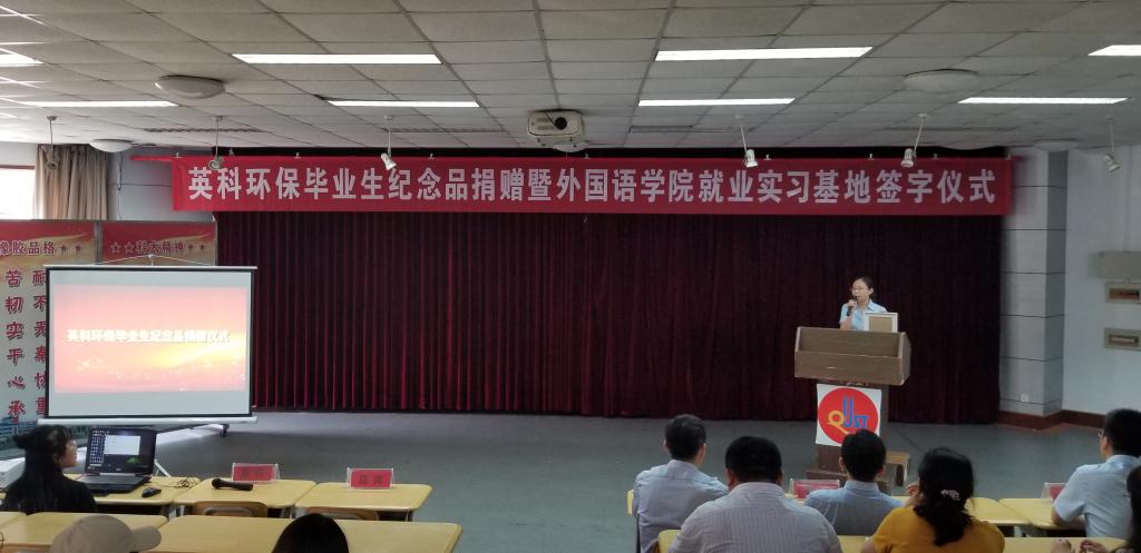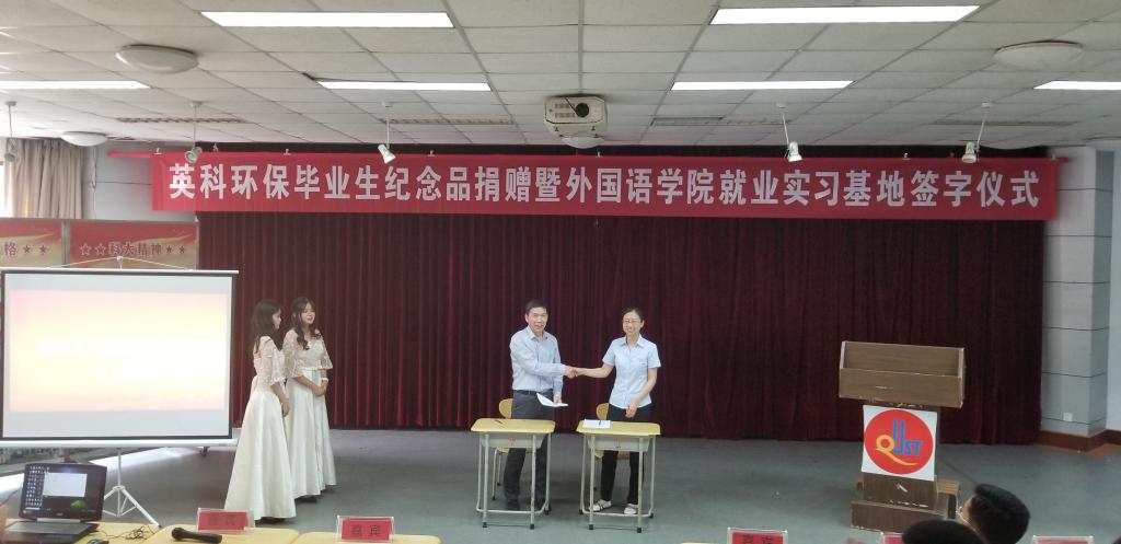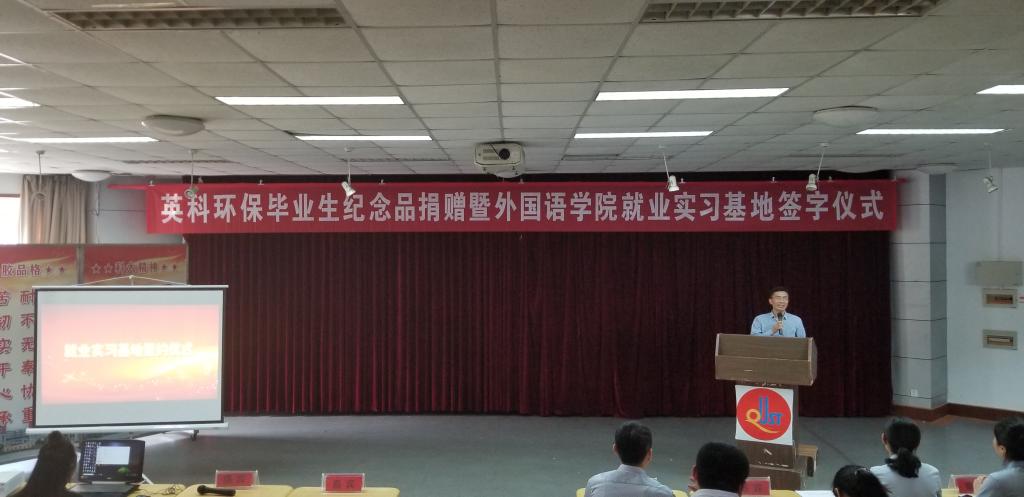 王茜简要地介绍了英科环保的情况,希望以此次毕业生纪念品捐赠暨就业实习基地签约为契机,深化校企合作,为公司提供更多的就业岗位,并为毕业生代表颁发毕业生纪念品。