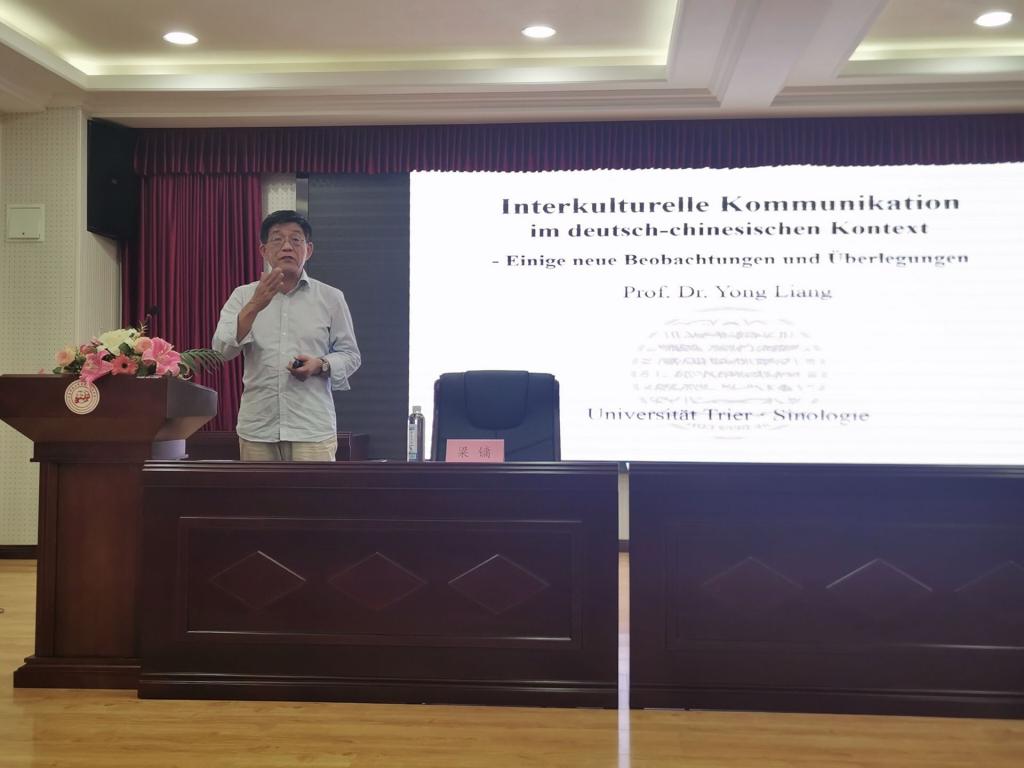 9月20日下午德国特里尔大学梁镛教授在外语楼学术报告厅为外院师生做了题为《中德背景下的跨文化交流——新观察与思考》的学术报告。报告由吕经理主持,德语系全体师生、外院其它语系以及中德、双元公司的部分老师和员工聆听了此次报告。