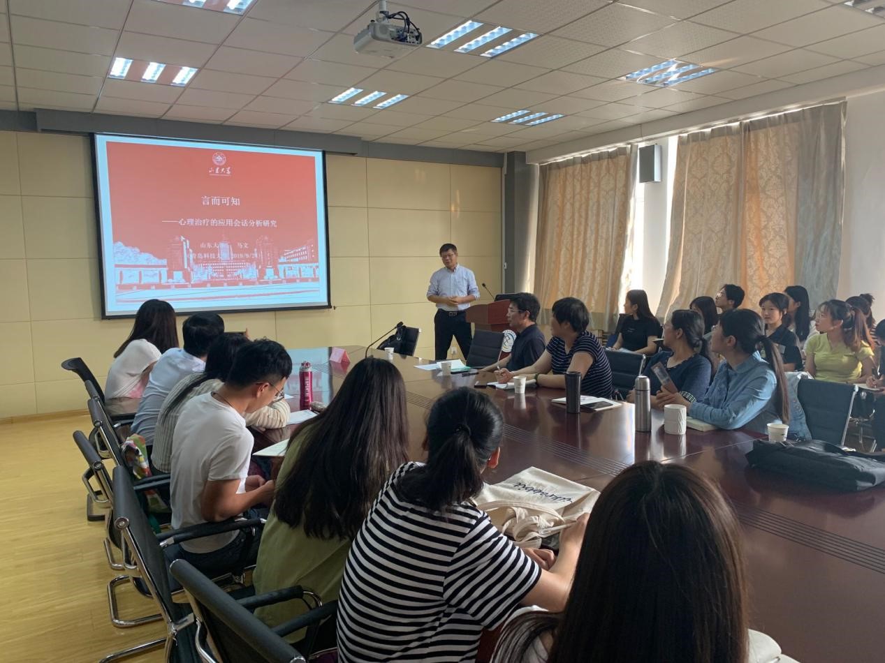9月24日下午,山东大学教授,博士生导师马文应公司邀请,在外语楼517会议室做了题为《言而可知:心理治疗的应用会话分析研究》的报告。报告会由经理尹洪山教授主持,经理助理刘靖教授及部分教师和研究生参加了报告会。