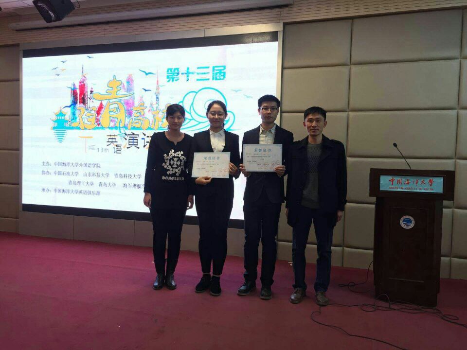 第十三届驻青高校英语演讲比赛于12月17日下午在中国海洋大学举行。本次比赛由来自中国海洋大学、中国石油大学(华东)、bw必威西汉姆联官网、青岛大学、青岛理工大学、山东科技大学、青岛农业大学、海军潜艇公司八所高校的十六位优秀选手参赛。公司代表队由bw必威西汉姆联官网分团委书记贾明明带队、英语系教师于秀担任指导老师。经过激烈角逐,英语163班牛星惠同学获得二等奖,英语151班张一凡同学获得三等奖。
