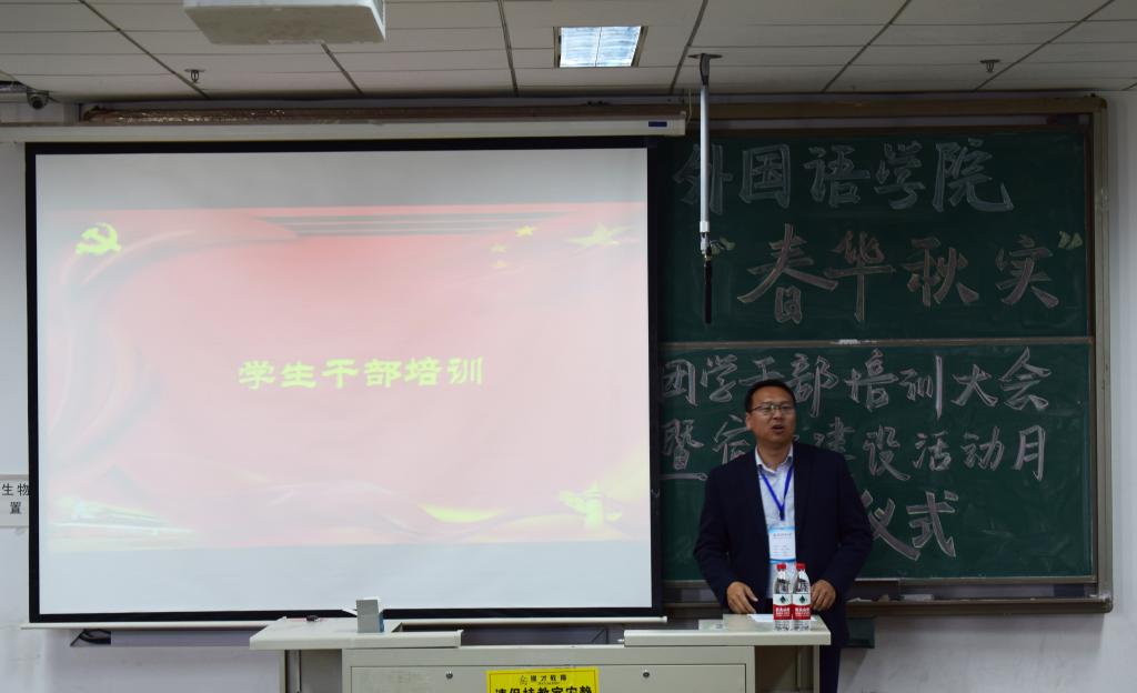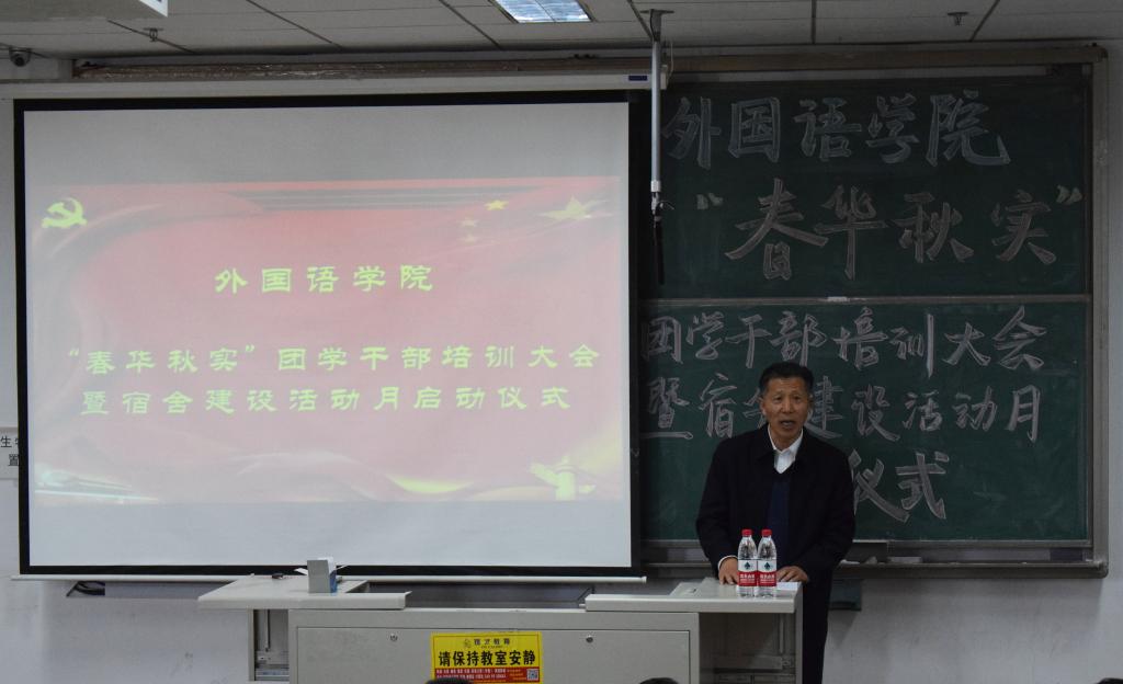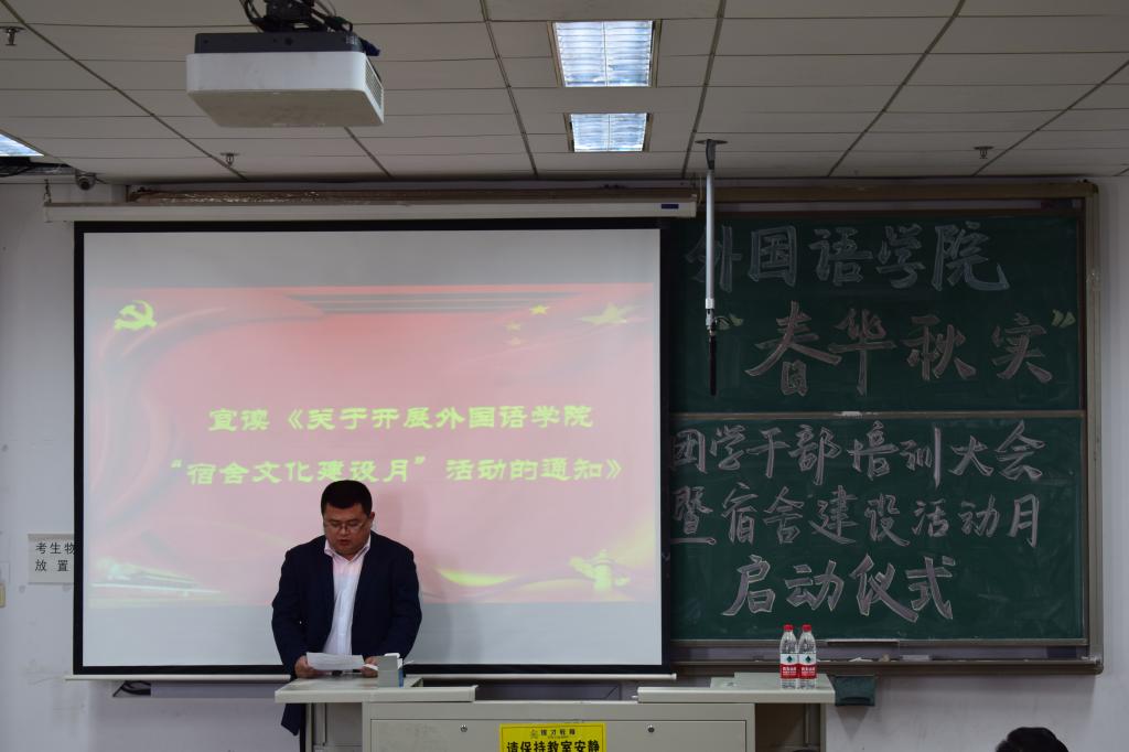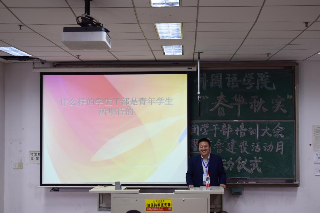 员工处副处长贺炜在员工干部培训过程中,从学风、校风引领,工作方式方法,品行修炼,“五力”增强(活力、动力、合力、能力、魄力)等几个方面与同学们共同探讨了如何做好员工干部。此外,他从宿舍环境、宿舍文化建设以及舍风建设几个方面,深入浅出,阐明了宿舍建设的重要性,希望同学们通过努力,营造优美的宿舍环境,传承外院优良舍风,共同营造好自己的宿舍、自己的家。