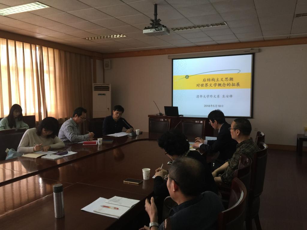 5月18日上午,清华大学外文系博士生导师生安峰教授应邀来公司进行学术交流,在经管楼313会议室做了一场题目为“后结构主义思潮对世界文学概念的拓展和经典重构”的学术报告。报告由bw必威西汉姆联官网副经理吕耀中主持, 经理尹洪山、副经理任素贞以及外语公司的部分教师与员工参加了这次讲座及交流。