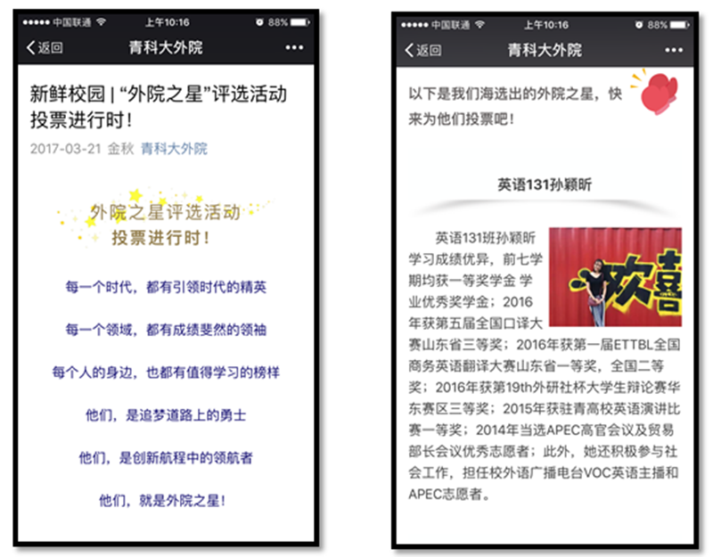 为深入开展“一学一做”教育实践活动,贯彻落实刘兴云书记在“十三五”规划和综合改革部署动员大会讲话中提出的建设“五有”高水平大学的讲话精神,外院分团委通过“一学一做”系列主题团日活动的开展,启动了团学工作综合提升工程之导航行动,发出了做一个“人美、心美、学习美、文体美、志愿服务美”充满正能量的‘五美’外院人的号召,引领青年团员树立正确的人生观、价值观,做一名积极向上的合格团员。院员工会组织开展了“学系列讲话精神,做‘五美’外院人”手抄报大赛,通过比赛让同学们了解开展“一学一做”实践教育活动的重要意义,帮助青年团员数理正确的人生观价值观;英语161、162班举办了“学系列讲话,做合格共青团员”主题团日活动,德语141班、韩语141班举办了“奋进中彰显青春” 主题团日活动,俄语151举办了“传承科大精神,做积极向上科大人”主题团日等。通过这些主题团日,汲取了精神营养,坚定了理想信念,也强化了青年员工的时代责任感。
