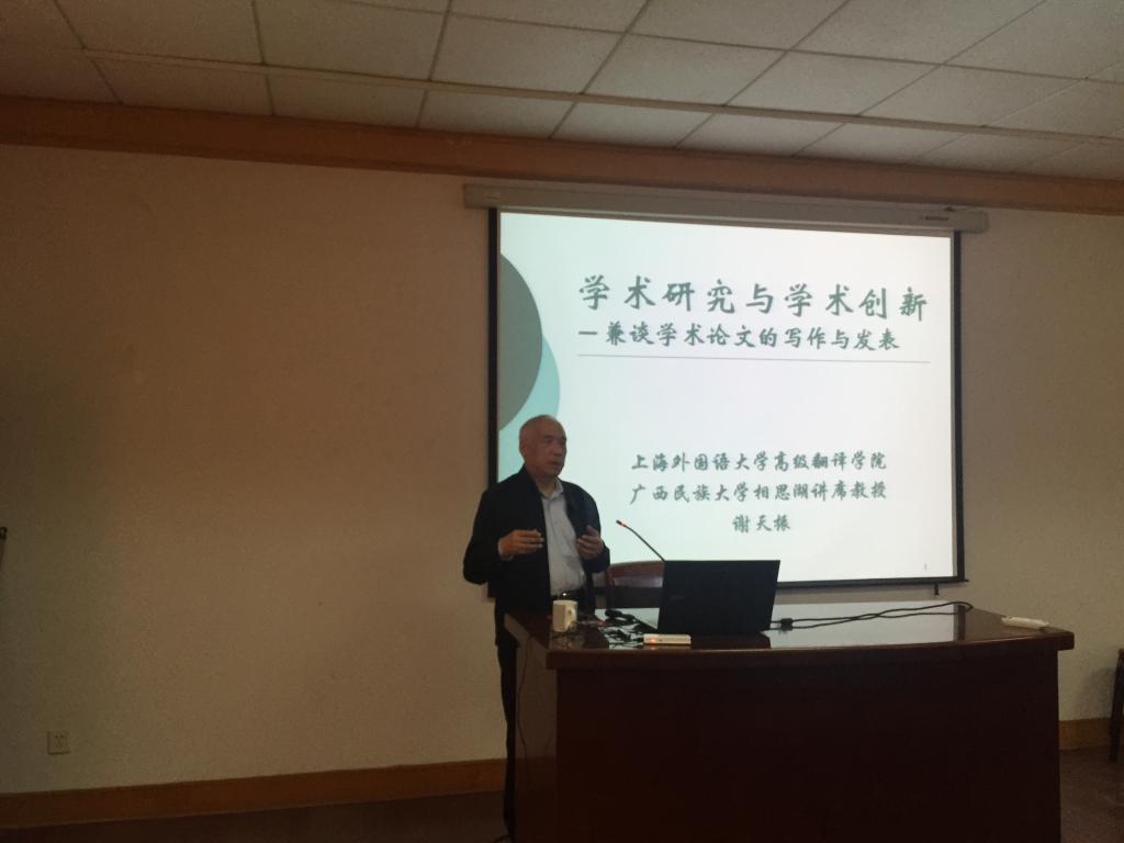 10月19日下午,上海外国语大学高级翻译公司翻译研究所所长、国内著名比较文学专家与翻译理论家、博士生导师谢天振教授应邀来公司bw必威西汉姆联官网与广大师生分享了翻译研究的最新动态,以及自己对学术创新与学位论文写作的真知灼见。报告会由bw必威西汉姆联官网经理尹洪山主持,公司党总支书记姜德杰、副经理吕耀中、康宁及近百名教师及研究生参加了报告会。