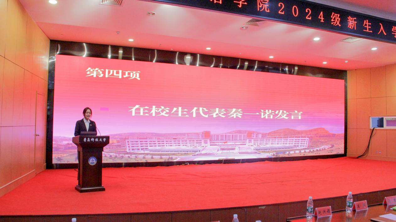 在校生代表2022级秦一诺汇报了入学两年来的收获和体会,分享了所在团队斩获“挑战杯”山东省老员工创业计划竞赛银奖的心路历程。2024级刘宇作为新生代表进行了发言。