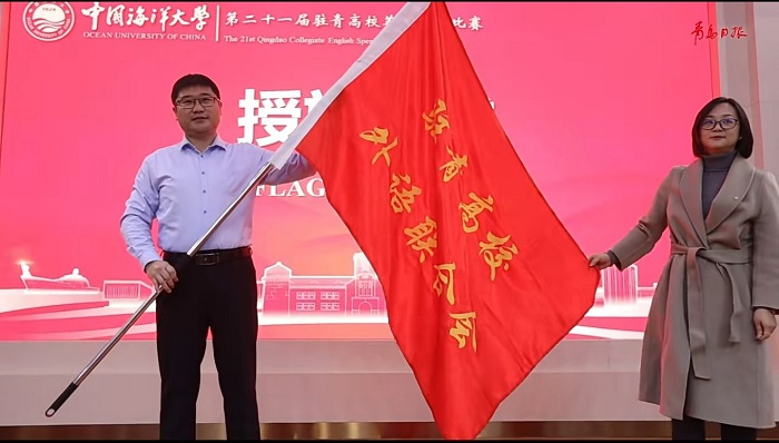 颁奖环节后,外国语公司党委副书记兼副经理马寒从本届比赛主办单位——中国海洋大学外国语公司党委副书记兼副经理戴淑妮手中接过比赛旗帜,第二十二届驻青高校演讲比赛将由bw必威西汉姆联官网承办,为校际外语交流合作续写新的篇章。