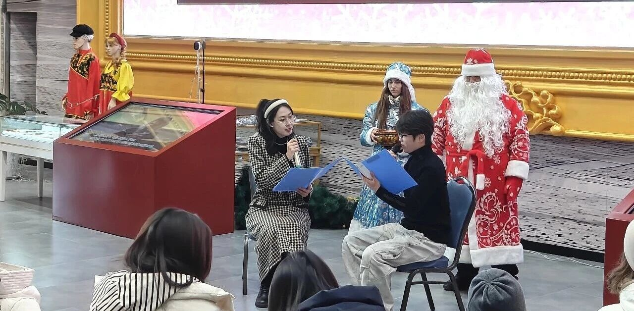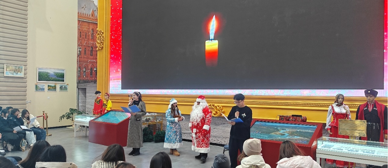 庆典以俄罗斯传统新年角色“严寒老人”与“雪姑娘”的惊喜登场拉开序幕,瞬间点燃全场氛围。随后,围绕中俄国情知识开展的趣味问答、“新年玩具”互动等环节,进一步加深了青年学子对两国文化的理解,让台上台下融为一体,欢声笑语不绝于耳。