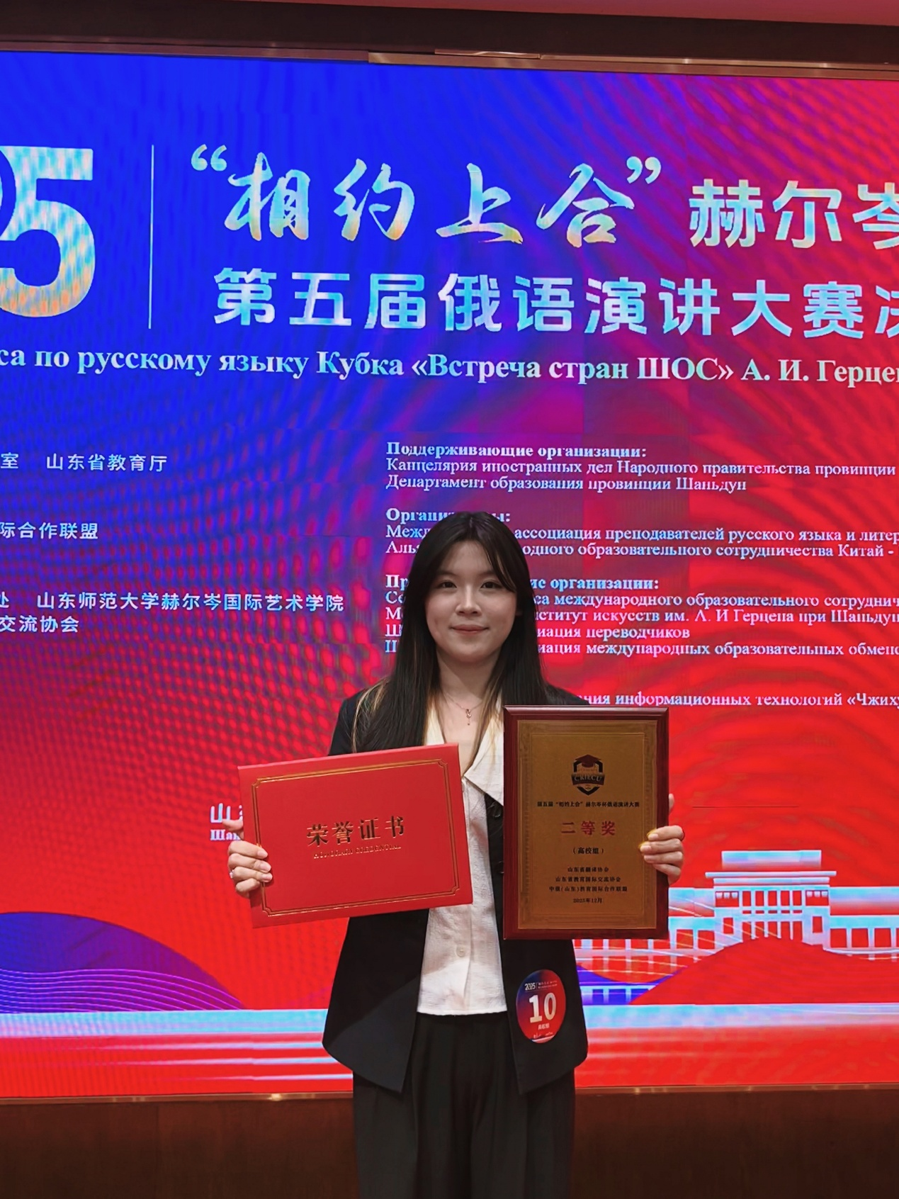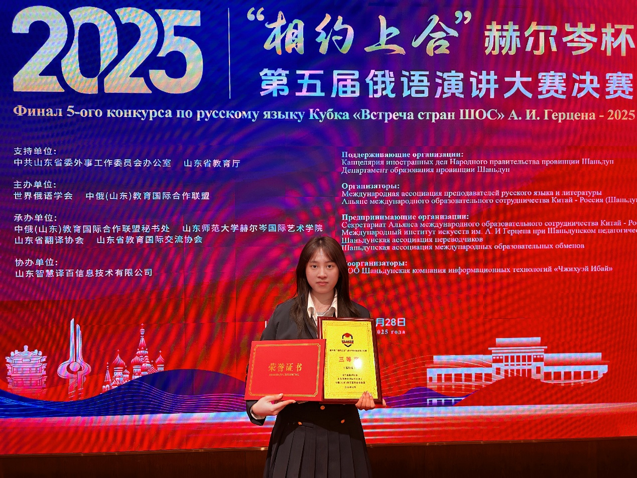 2025年12月28日,第五届“相约上合”赫尔岑杯俄语演讲大赛决赛在山东师范大学(千佛山)校区成功举办。在汇集全国60名决赛选手的激烈角逐中,公司俄语专业毛庆玲同学获高校组二等奖,廖倩倩获三等奖。同时,公司获“大赛优秀组织单位奖”,蒋春丽老师获“优秀指导教师奖”。
