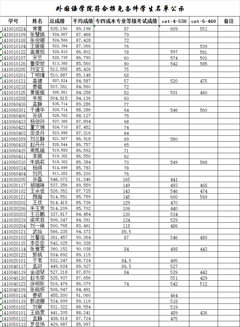 英语(语言文学方向)、英语(商务英语方向)和俄语专业推免生的专业四级考试成绩必须在70分(含70分)以上;