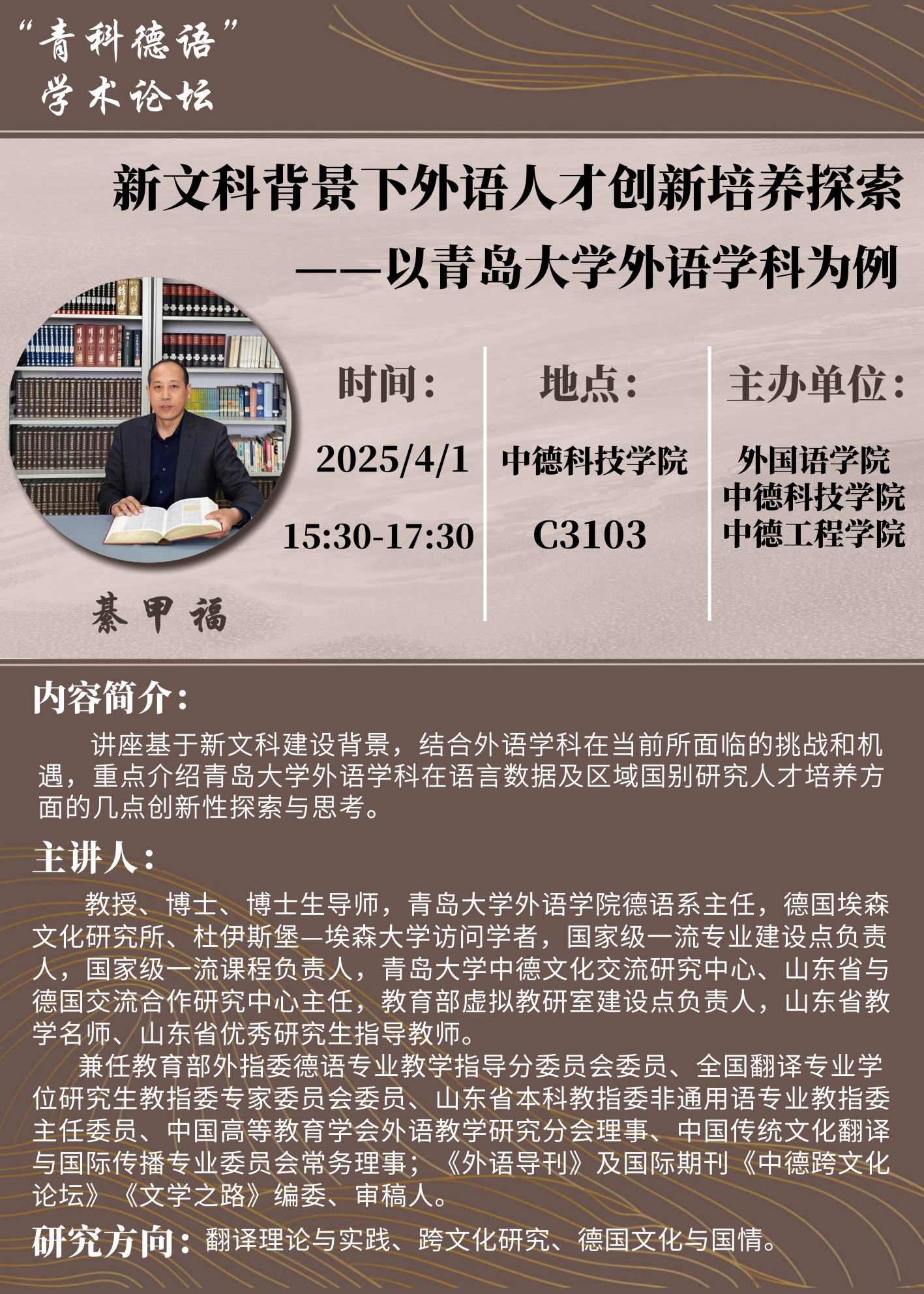 綦甲福教授、博士、博士生导师,青岛大学外语公司德语系主任,德国埃森文化研究所、杜伊斯堡—埃森大学访问学者,国家级一流专业建设点负责人,国家级一流课程负责人,青岛大学中德文化交流研究中心、山东省与德国交流合作研究中心主任,教育部虚拟教研室建设点负责人,山东省教学名师、山东省优秀研究生指导教师。