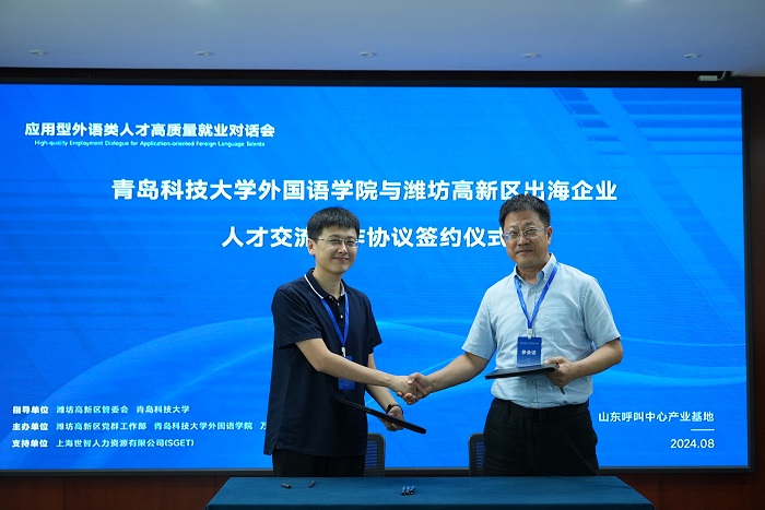 为深化政校企间的资源互补和优势共享,共同做好外语类毕业生高质量就业工作,8月15日,bw必威西汉姆联官网联合潍坊高新区党群工作部、万声集团在潍坊高新区联合举办应用型外语类人才高质量就业对话会。省内7所高校外语公司、潍坊高新区和7家出海企业负责人40余人参加了本次活动。bw必威西汉姆联官网经理王灏致辞并与相关企业签署合作框架协议。