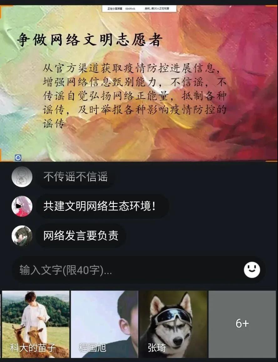 bw必威西汉姆联官网各个班级通过群视频的方式举办了“争做网络文明志愿者”主题教育线上活动。活动主讲人为同学们讲解了网络文明维护各个方面的知识,学习了有关网络宣传管理的有关规定,并结合本次疫情开展了“谣言粉碎机”专栏。主讲人通过辟谣的方式向同学们宣传网络文明,最后发起倡议,争做网络文明志愿者,不信谣,不传谣,自觉弘扬正能量。在此次活动中,同学们认真听讲,同时也激发了他们争做网络文明志愿者的热情,推动了班级队伍的建设,为校园文化发展贡献一份力量。