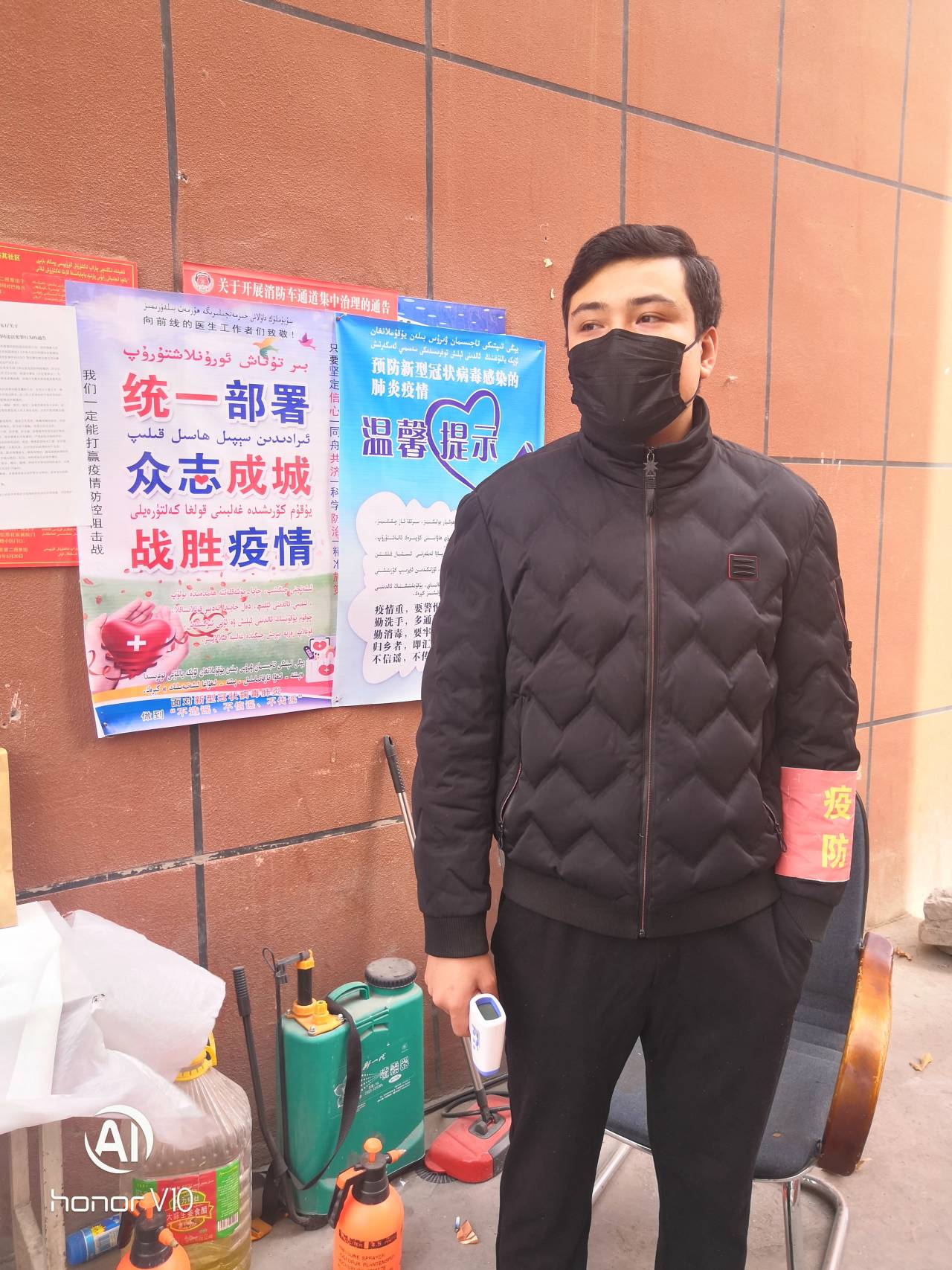 日语182班的艾力喀木江.艾尔肯主动请缨加入防控疫情的志愿者队伍,为坚决遏制疫情扩散、夺取防控斗争胜利贡献力量。他主要负责每天在社区值班监督居民们的外出情况、佩戴口罩情况、给他们量体温做好记录工作,以及给隔离户家庭购买生活用品以及蔬菜水果。他说,自己很骄傲能参与到疫情防控工作中,小区防疫志愿者队伍都是一个个平凡的人,却用行动书写着大大的“不平凡”。相信,在政府的坚强领导下,一线战士的忘我战斗下,热血志愿者的参与下,广大人民群众的响应下,我们一定能够打赢这场疫情防控的战役!胜利的曙光一定会属于我们!