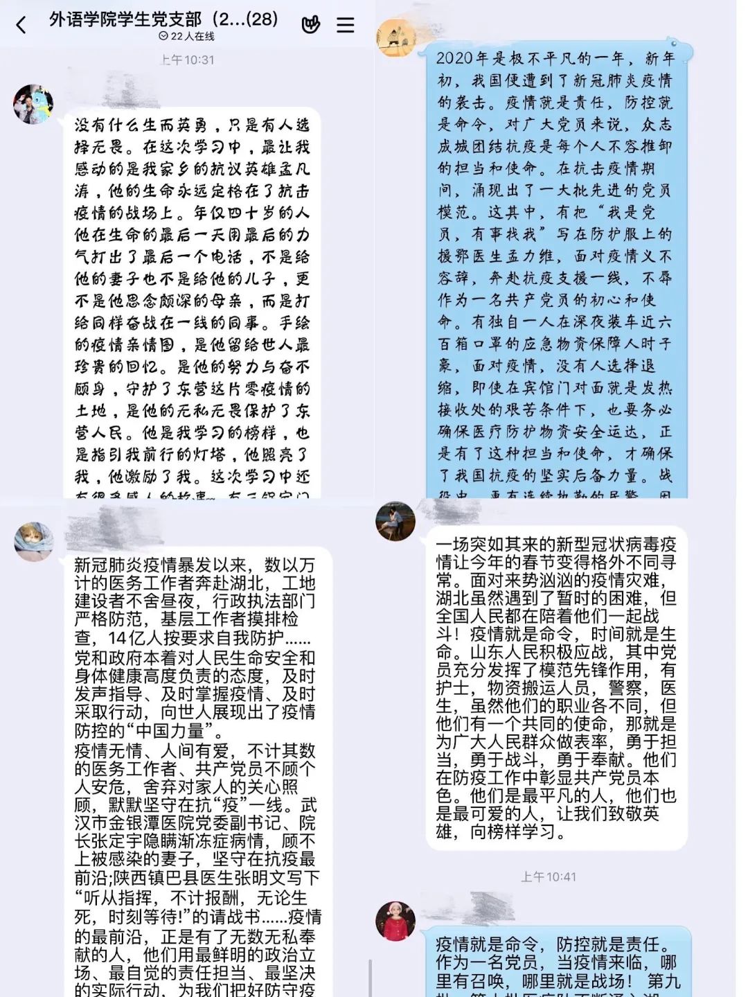 通过此次主题党日活动,青年党员们更加深刻地领悟了共产党员全心全意为人民服务的宗旨。疫情就是命令,防控就是责任。作为一名党员,当疫情来临时,哪里有召唤,哪里就是战场。敢于担当,勇于奉献,身先士卒,这是作为一名共产党员应有的精神;一切为了人民,一切为了群众,这是作为共产党员要牢记的初心。作为党年轻有力的新鲜血液,我们更要向这些榜样致敬,更要学习他们的榜样精神,不忘入党初心。