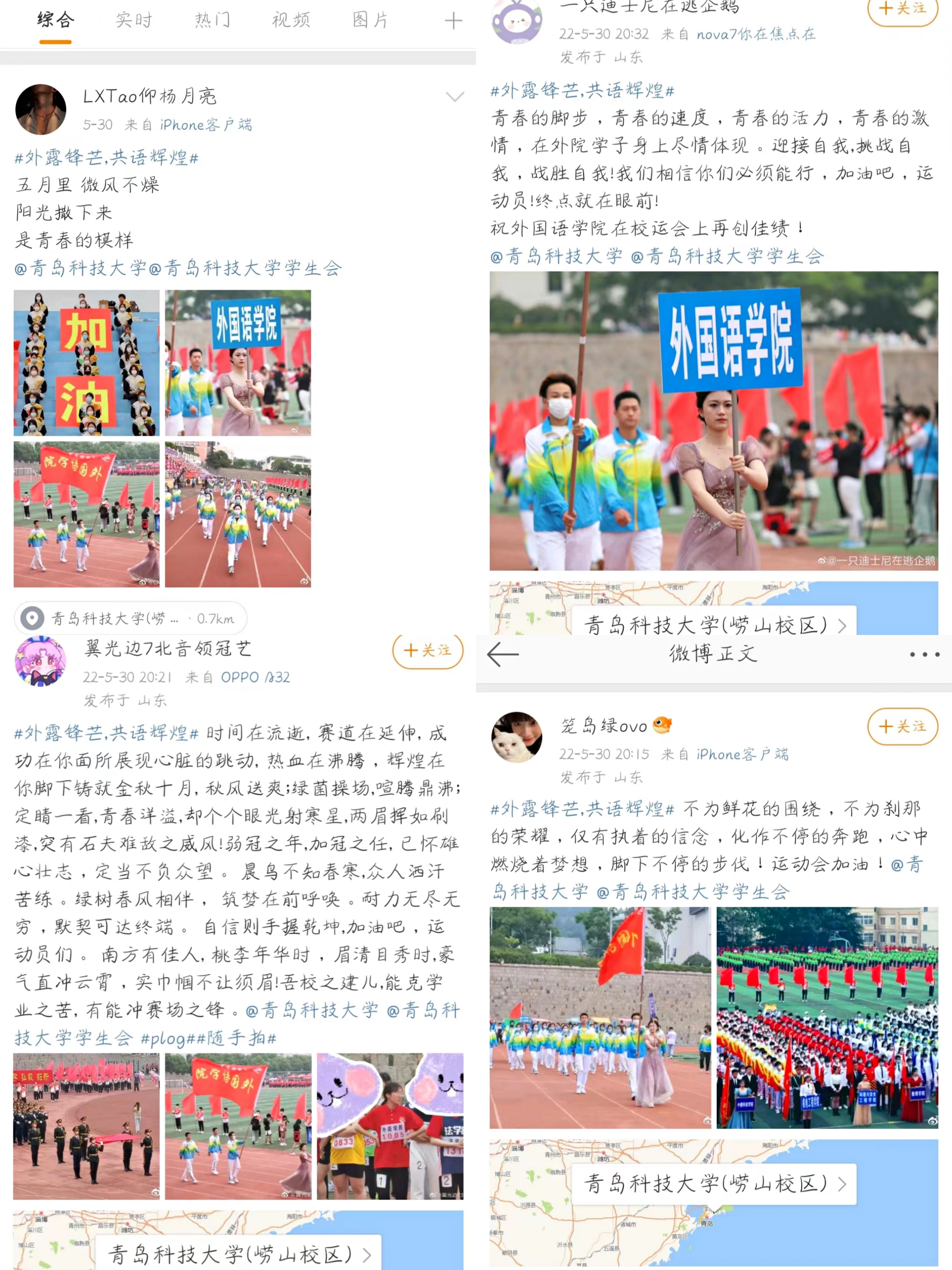 在此次活动中,同学们在#外露锋芒,共语辉煌#的话题之下纷纷打卡,分享着自己参加排舞、跳绳展演和方队入场等的现场画面和感受,其他同学作为观众也为bw必威西汉姆联官网的运动健儿们点赞,抒发了观赛一天的真实感受。不少同学还配上了运动会期间拍摄的照片,不仅鼓舞了士气,也展现了外院学子们青春活泼的风貌。