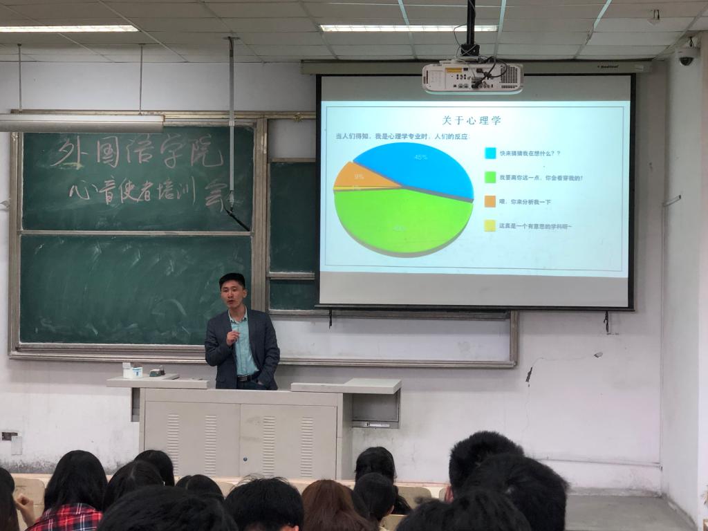 会上,贾明明从“心理基本知识”、我们是谁”、“我们做什么”、“面对无法解决的心理问题的应对”四方面为心理委员进行了培训,带领同学们学习了心理学知识,帮助大家明确定位,了解责任。他指出作为心理委员要学会包容,耐心并积极的呵护每一个受伤的心,小心各种并发心理问题,希望同学们通过努力成为一名合格的心音使者。