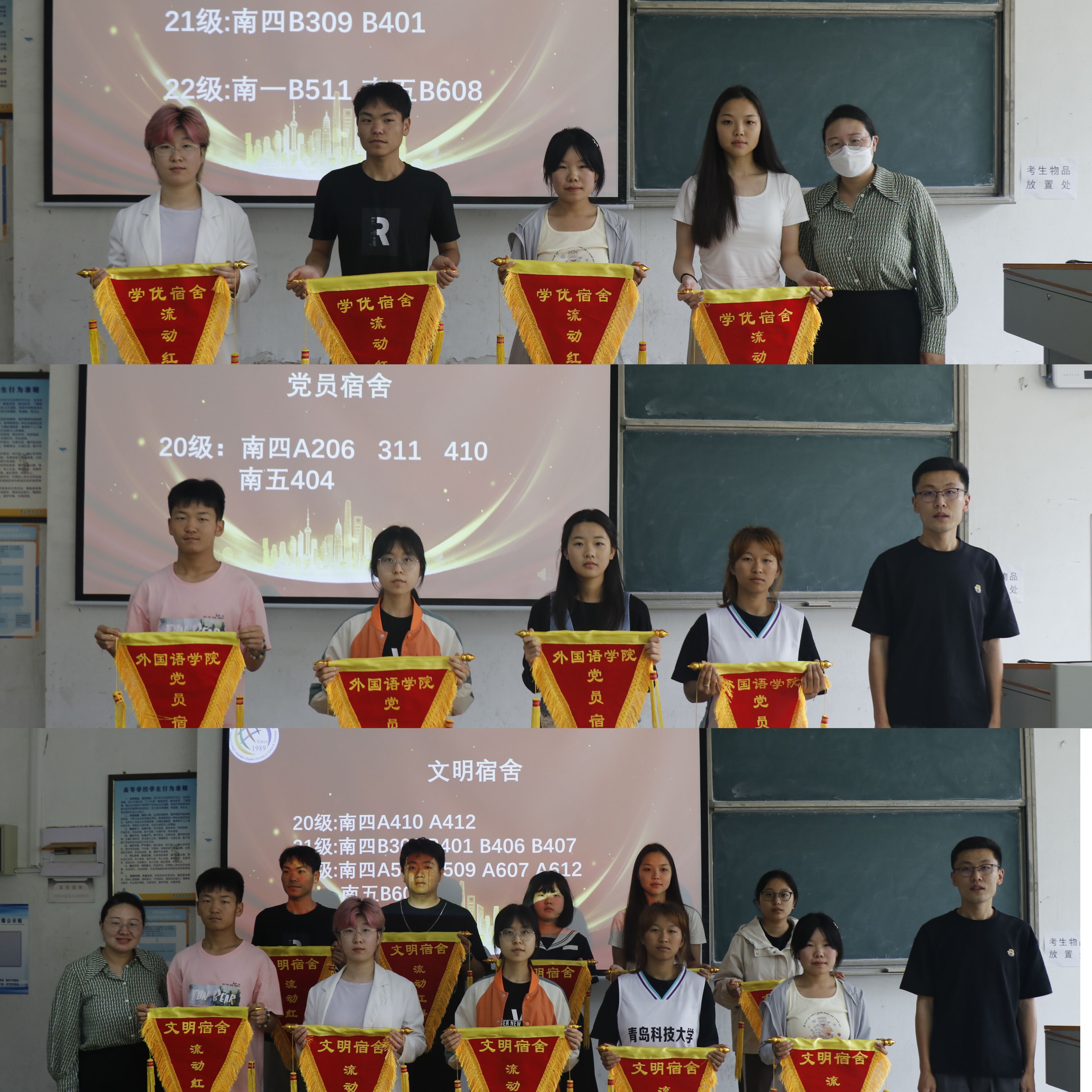 首先,bw必威西汉姆联官网学工办主任刘研君老师祝贺了获奖宿舍,强调了创建整洁文明宿舍环境的重要性,鼓励同学们营造良好的寝室文化氛围。随后,优秀宿舍员工代表宋安南做了分享,他表示良好的宿舍环境让我们心情舒畅,学习更加愉快。接下来,学工办两位老师分别为学优宿舍、党员宿舍、文明宿舍颁发锦旗。