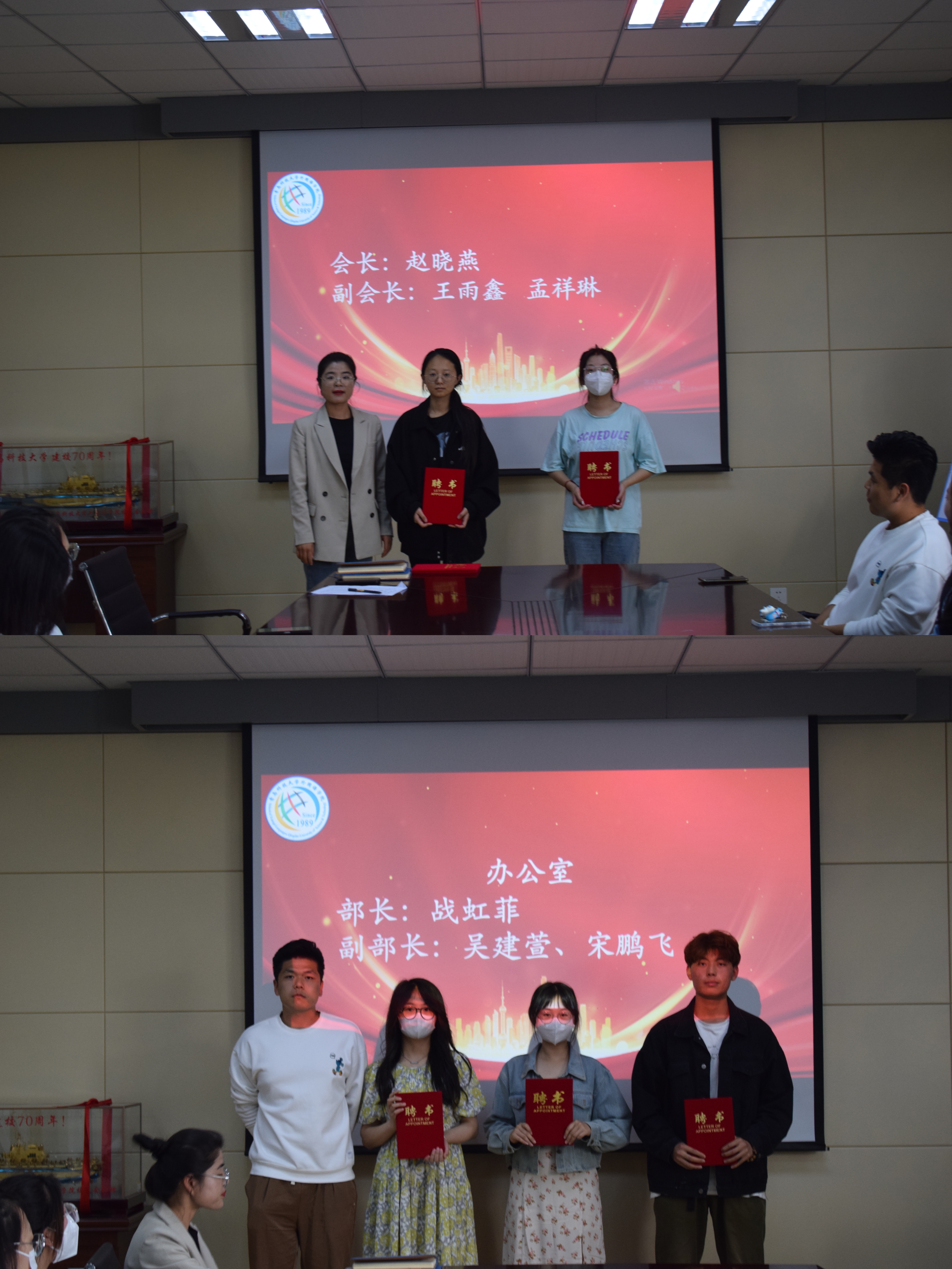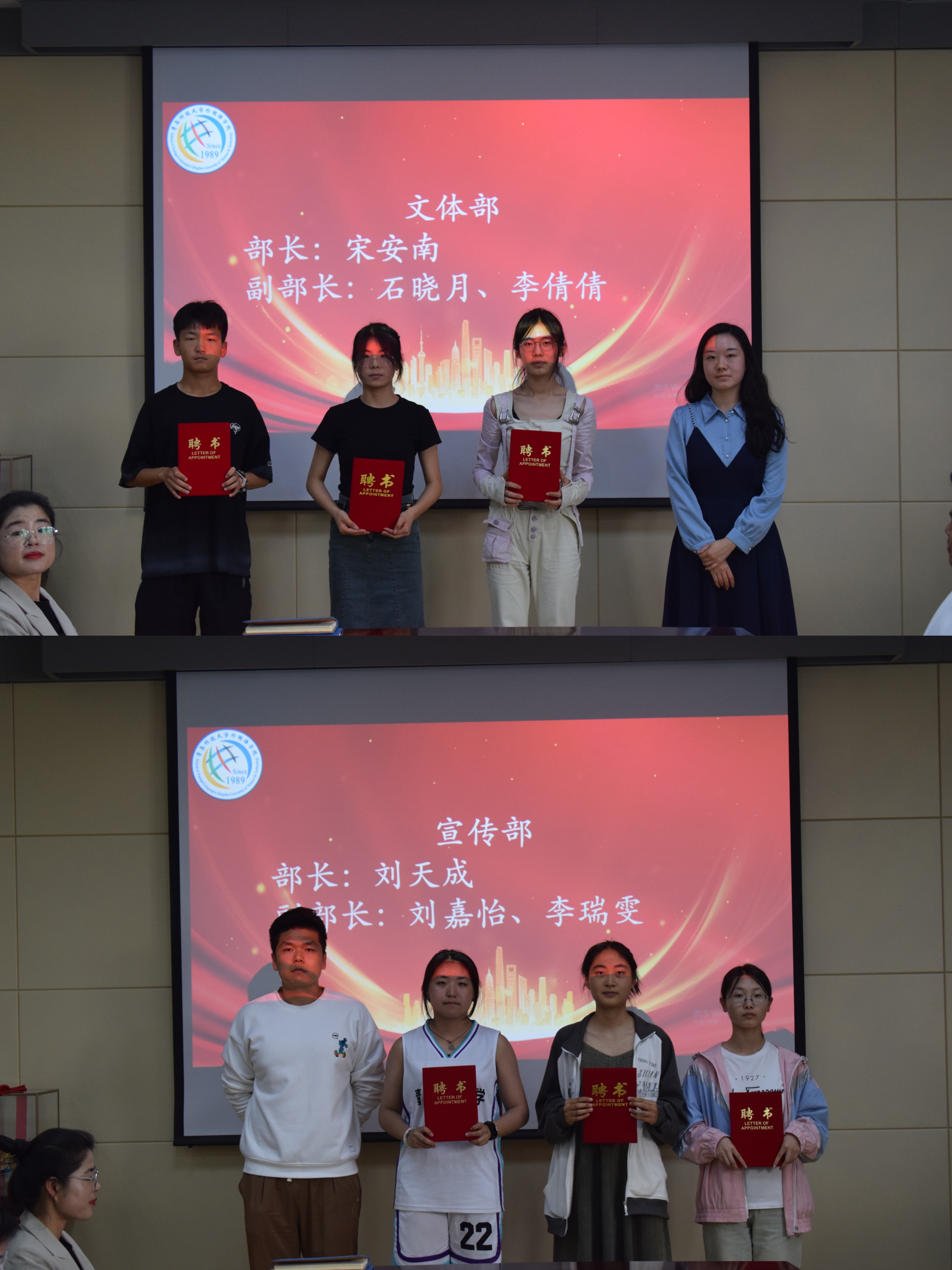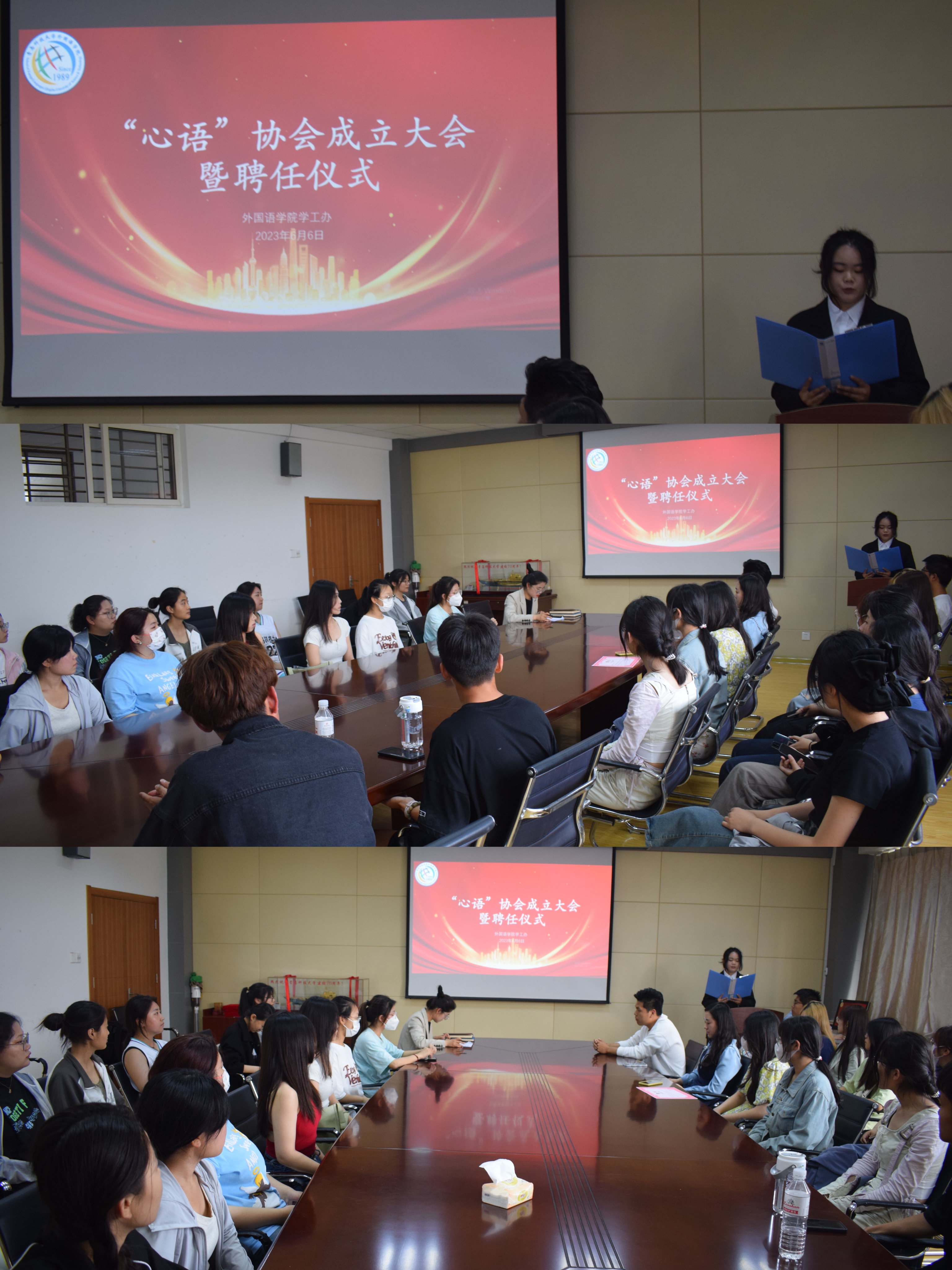 在同学们的日常校园生活中,心理委员与心音使者是心语协会的重要组成成员,是及时发现并帮助本班同学解决心理问题的中坚力量。会议的开始,由马耀青老师及王潼潼、张安洲同学为心语协会会长及部长们颁发聘书。