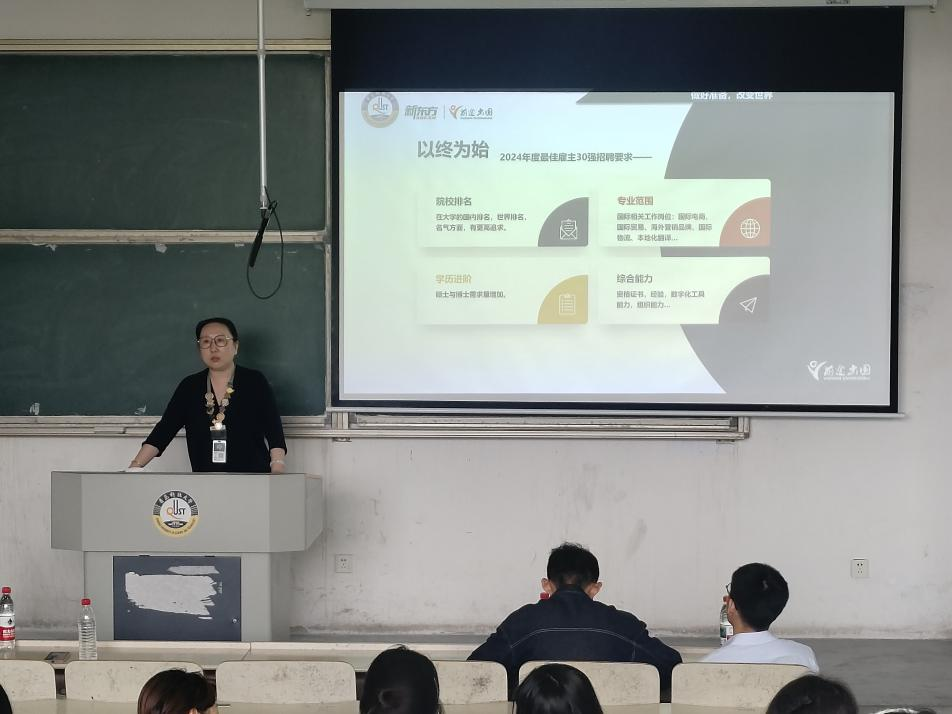 新东方首席内训师张高帆以生涯规划为切入点,围绕政策导向与个人发展双重视角,提出“停止内卷,换道超车” 的复合能力发展路径,鼓励同学们打破固有竞争模式,通过差异化发展提升竞争力。同时,张老师还着重介绍了 AI 工具在职业规划中的创新应用,倡导借助 “职业画像测评” 与 “职业测评系统”,科学分析个人兴趣与行业发展趋势的契合度,为精准就业提供有力支撑。