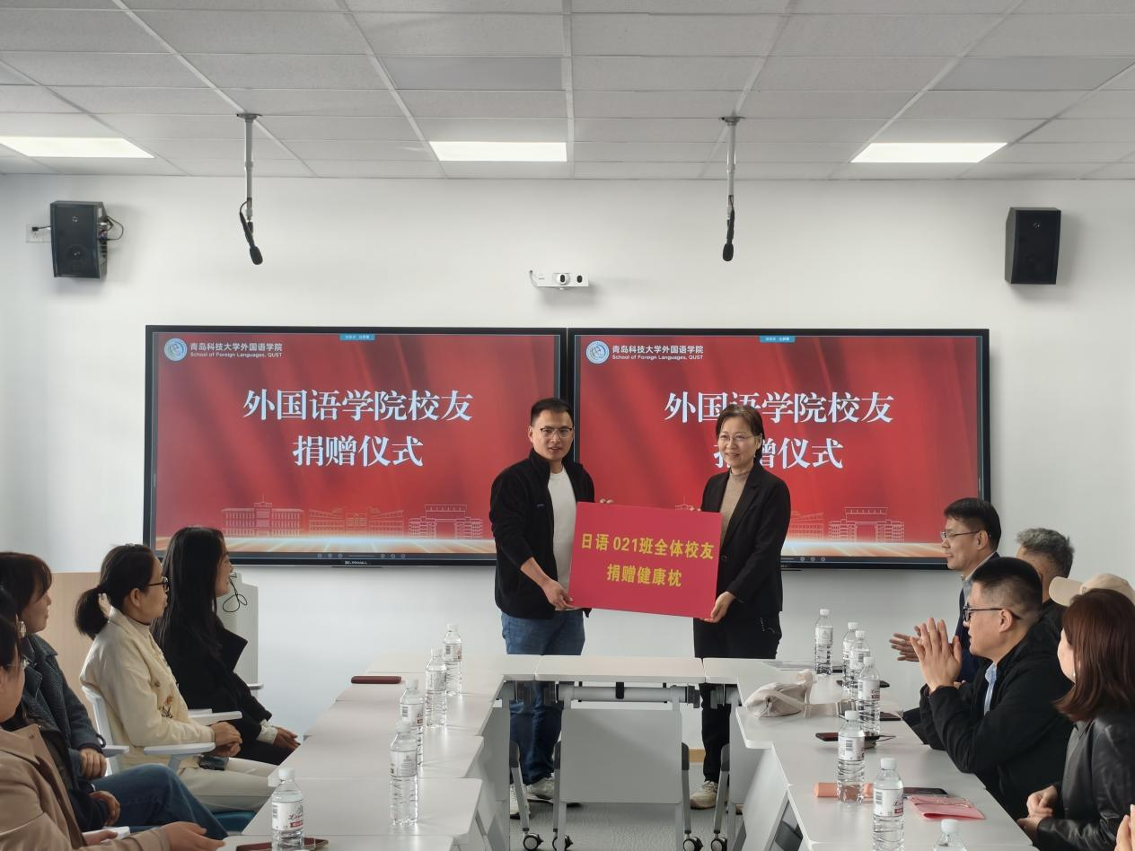 纪念大会上,日语021班员工向公司捐赠健康枕,表达对母校的深厚情谊和美好祝愿。党委书记曲斌艳代表公司接受捐赠,感谢员工们对公司师生的关爱。